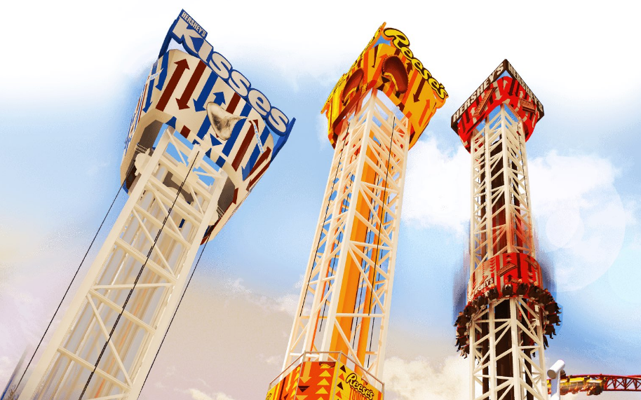 - Ainsi qu’une dernière de 57 mètres (Hershey’s Tower) 20 places , mettant en vedette « deux expériences défiant la gravité, SPACE SHOT & TURBO DROP, (Lancement vers le haut, puis descente rapide vers le bas)